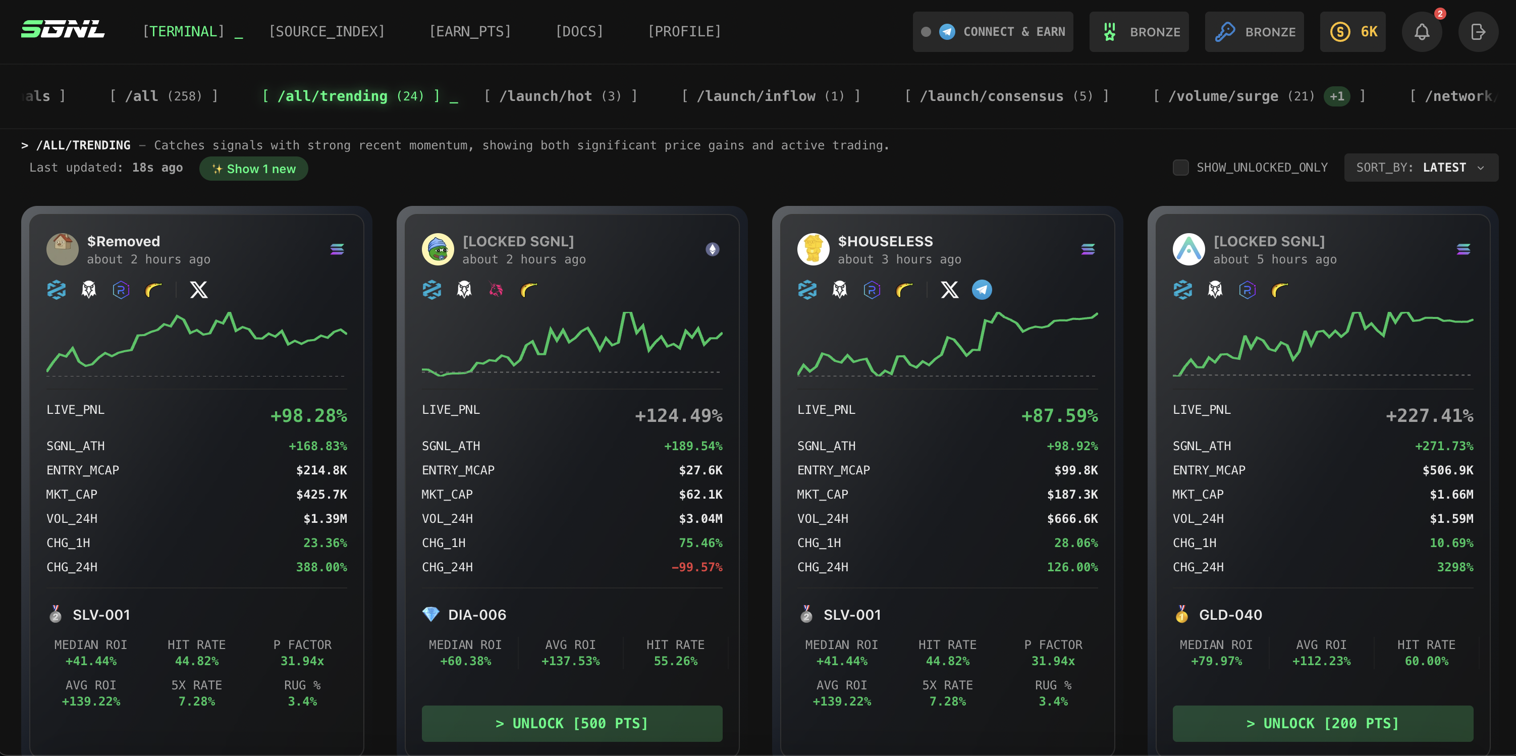 - [SPEND] — Use your points to tactically unlock any individual signal from a tier above your own. Instantly access the network's highest-conviction alpha when it matters most.